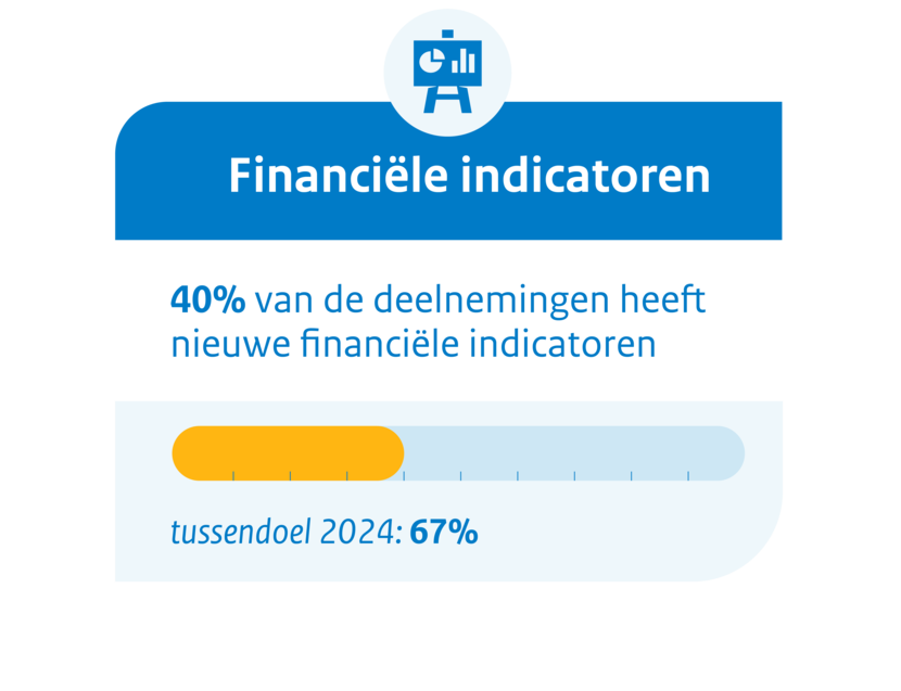 Eind 2023 waren bij 4 deelnemingen indicatoren en bijbehorende doelstellingen vastgesteld: BNG Bank, Holland Casino, Invest-NL en NWB Bank. In 2024 zijn daar NS en FMO bijgekomen. Hiermee is het doel om in 2024 met 6 deelnemingen nieuwe afspraken te maken niet gehaald. Bij een aantal deelnemingen was er sprake van een langlopende strategievernieuwing waardoor er nu nog geen concrete financiële langetermijndoelstellingen konden worden afgesproken. Naar verwachting zullen deze processen in 2025 afgerond worden.