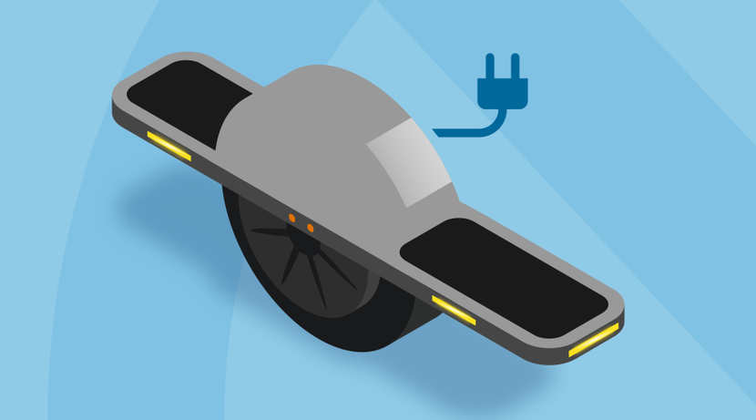 Een elektrische eenwieler met een plank om op te staan. De onewheel gaat door beweging vooruit of achteruit. Er is geen stuur of zitplaats aanwezig.
