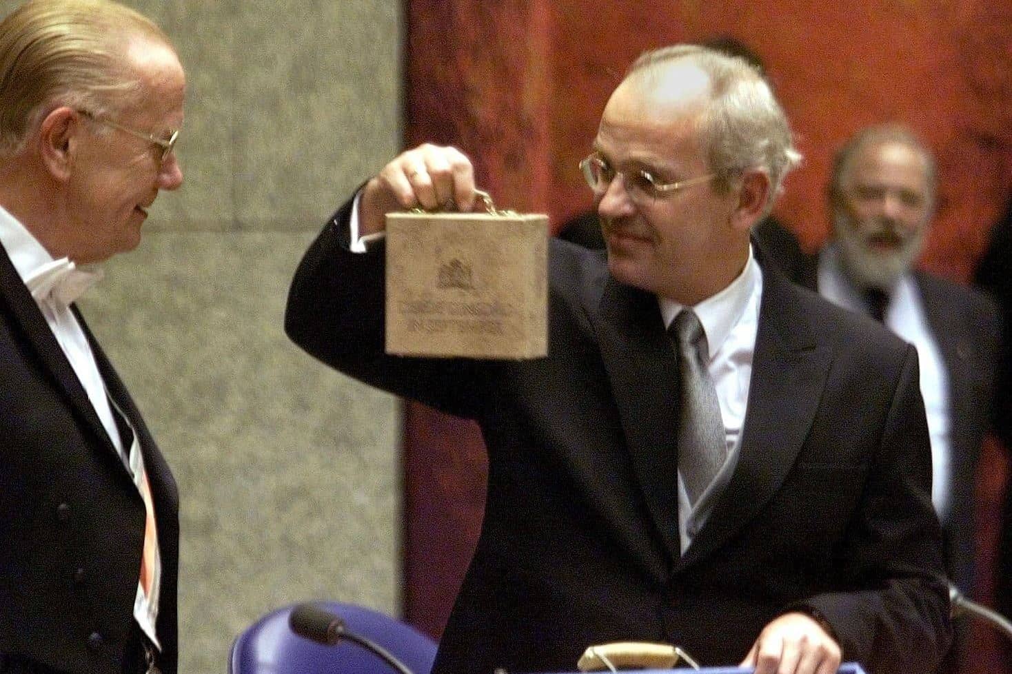 Oud minister Zalm toont het mini-koffertje met de CD waarop de Rijksbegroting staat.