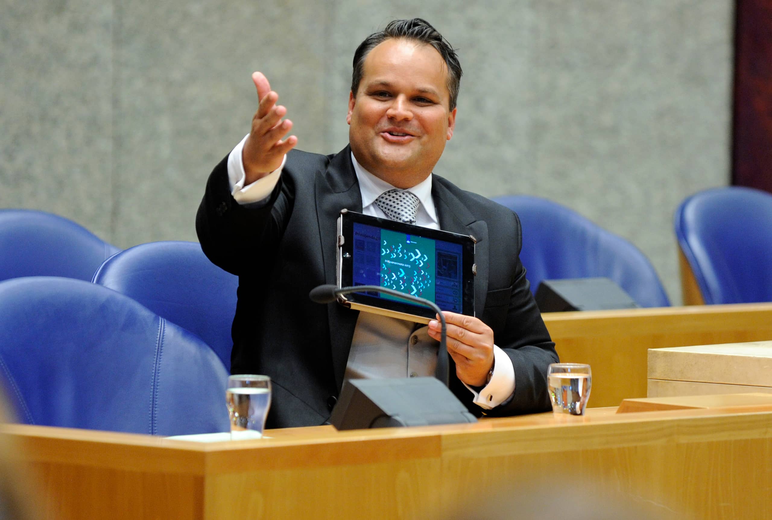 Oud minister De Jager presenteert in 2012 een digitale versie van de miljoenennota op een iPad.