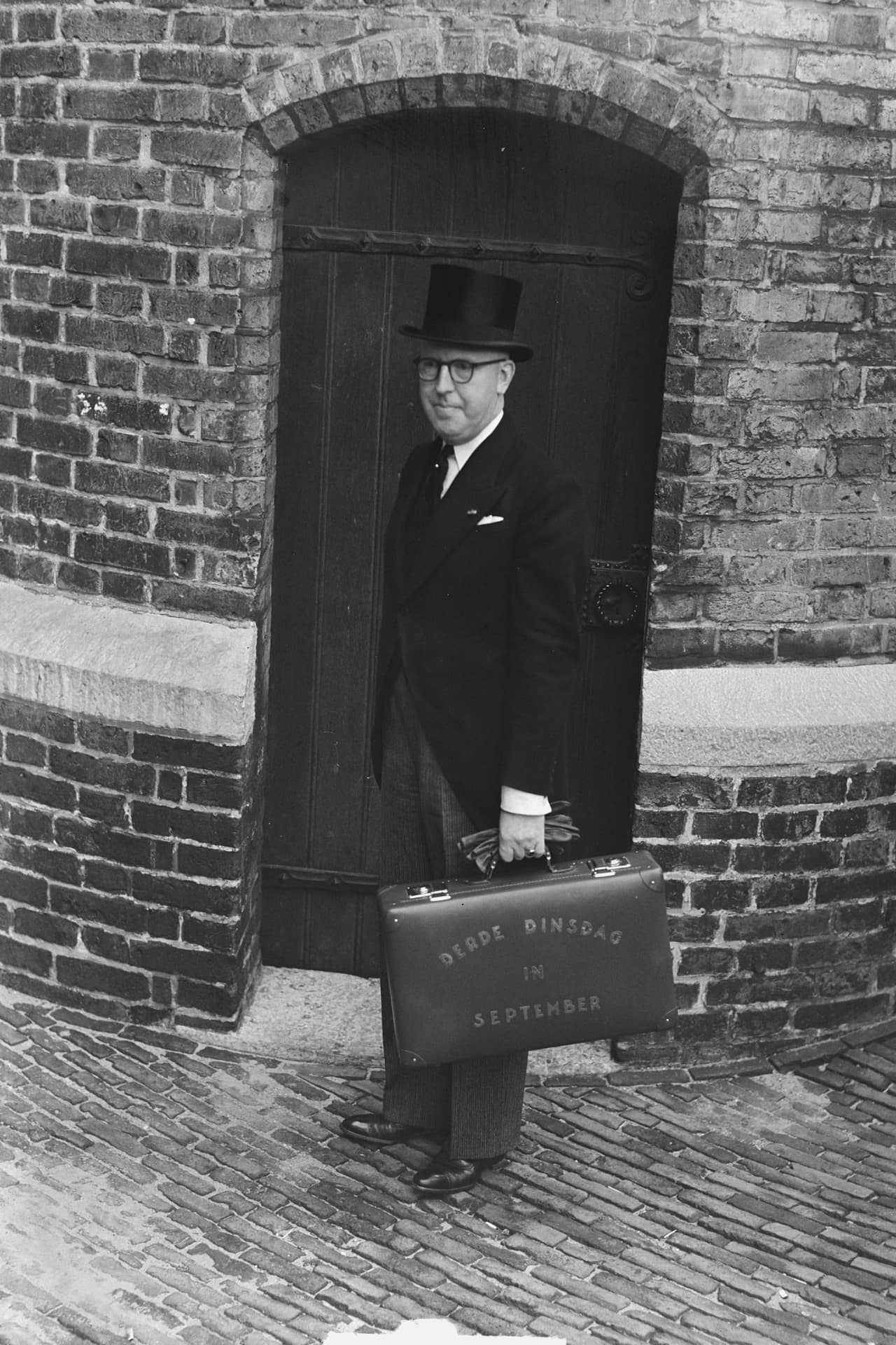 Minister Lieftinck kocht bij leerhandel Van de Broek in Den Haag een eenvoudig bruin koffertje. Hier liet hij in goudkleurige letters de tekst ‘derde dinsdag in september' op aanbrengen. Al snel zijn de papieren letters vervangen door goudverf.